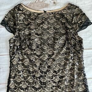 Jessica Howard Cocktail Dress Formal Dress Party Dress Special Occasion Sheath Dress Mini Dress Lace Sequins Embellished Art Deco Cap Sleeve Scalloped Hem Black and Nude sparkle sheer Size 6 Wedding Guest Evening Wear