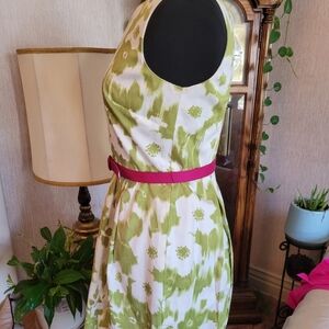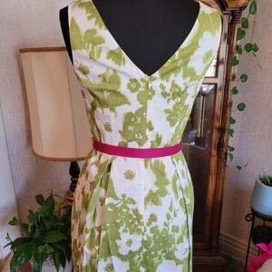 Chic midi dress with green floral design. Accentuated by a bold pink belt. Ideal for stylish outings.