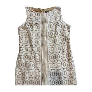 Jessica Howard sheath cocktail dress in a flattering and elegant plus size 14. Designed with a white crochet-style lace overlay and a beige nude lining, this dress exudes classic charm with a modern twist. The sleeveless silhouette and fitted shape make it perfect for special occasions, work events, or a polished daytime look.