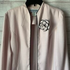 Light pink blazer and matching flower brooch by vintage Jessica Howard. This open front jacket is lined with black around the collar and down the front. The collar is higher in the back and tapers down to the open front. The long sleeves have a small slit and the bottoms are also lined with black. The jacket has a matching flower brooch with light pink petals that are on petals of black. The pin is wrapped and made to look like a small stem. The fabric has a very subtle, small chevron pattern. It also has pin-sized tufts that some might think look like pilling but it may also be part of the fabrication. It is pre-owned but in good condition. There is a light, small stain on the back right shoulder blade (see photo. It's very light). It also used to be part of a 3-piece set.