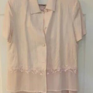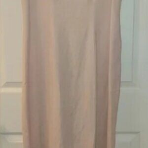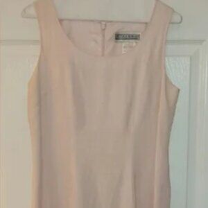 This dress is a sophisticated sheath in a soft pink peachy hue, perfect for wedding guest or cocktail occasions. It features a sleeveless design with a scoop neckline, offering a sleek and elegant silhouette. The dress's minimalist style is enhanced by a jacket with subtle texture detail at the hem, adding a touch of refinement.