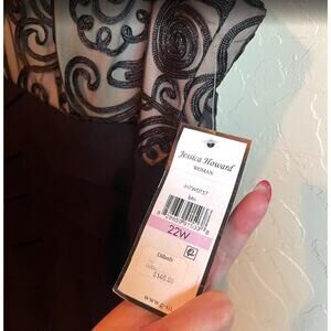 Make a stunning entrance in this elegant Jessica Howard dress, brand new with tags! This gorgeous black dress features an intricately embellished lace bodice, an illusion neckline, and a beautifully tiered, flowing skirt, creating a sophisticated and flattering silhouette perfect for special occasions, cocktail parties, or formal events.