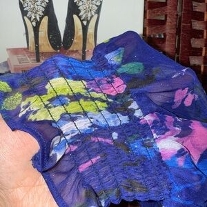 This elegant sundress by Jessica Howard features a vibrant floral pattern in blue and pink hues, perfect for a wedding guest or cocktail occasion. The dress boasts a flattering V-neckline and long bishop sleeves, adding a touch of sophistication to its flowing silhouette.