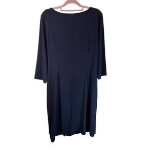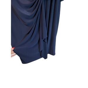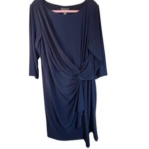 Jessica Howard elegant navy blue dress crafted from a soft, flowing stretch fabric with a smooth, lightweight feel. Designed with a draped wrap-style front and a flattering twist knot detail at the waist that creates beautiful ruching and an asymmetrical cascading overlay. Features a modest scoop neckline, three-quarter sleeves, and a polished silhouette that skims the body without clinging. Fully lined for comfortable coverage and structure. Pull-on style with no back zipper. Hem falls around the knee to just above the knee depending on height, with a subtle asymmetrical finish for added elegance. Size 16W (see tag). Excellent condition. Colors and measurements may vary slightly due to lighting, screen resolution, or AI-generated rendering.