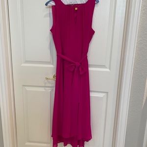 Jessica Howard, size 12, fuchsia, like new, Sleeveless , round neck with accent v, belt, high low multi length, flare dress