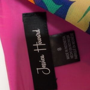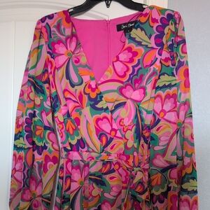 Stylish dress with vibrant floral patterns. Features pink, blue, and yellow hues. perfect wedding guest dress. worn once. euc garden party, light sorry, sheet sleeves, modest. waist tie, back zip.