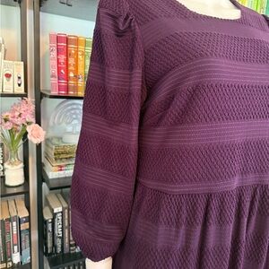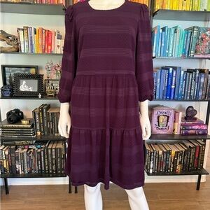 Chic plum striped dress with a tiered design. Perfect for versatile styling. 3/4 sleeves. Pull over style. Button at back neck. Lined. Size Large. Layflat measurements: pit to pit 18.5”, waist 18.5”, length from pit seam 28”