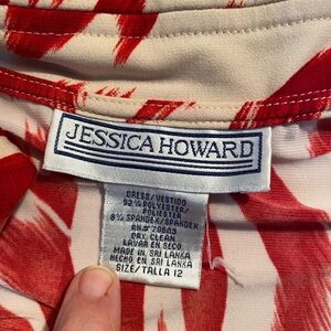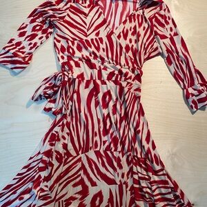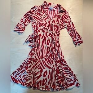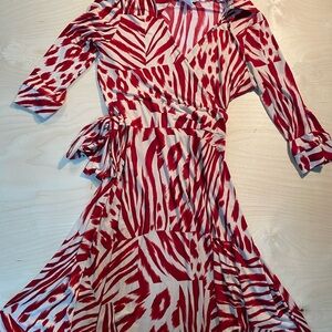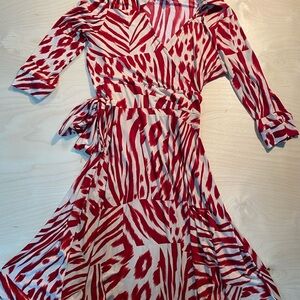 Stylish midi dress with bold red and white pattern. Features a wrap design and three-quarter sleeves. Perfect for any occasion.