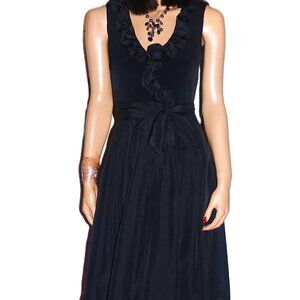 You are viewing a cute party dress by Jessica Howard Sz 4, Polyester/spandex, Black, ruffles Measurements were made with the garment lying flat unstretched bust 31", waist 27", shoulder to hem 62". Good condition with a little hole on lining bottom of dress ,not visible on the outside (see pics)