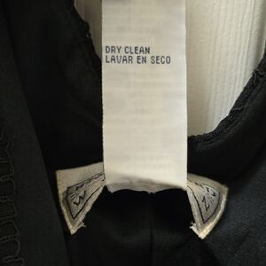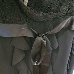 Sleeveless black dress with a deep V neckline. Lace bodice and flowing ruffled chiffon skirt. Satin waist tie accent. Elegant and versatile evening piece. a lil markings on satin waist tie as shown in pics.