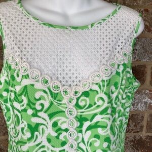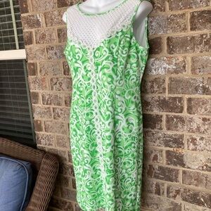 Jessica Howard shift dress with green and white swirls and white embroidery down front. Mesh neckline. Size10. Zipper down back. She’ll 97% polyester 3% spandex. Combo 70% cotton 30% polyester. Lining 100% polyester. Hand wash cold. Excellent preowned condition . Armpit to armpit Measures 18”. Shoulder to hemline measures 36”.