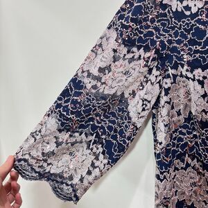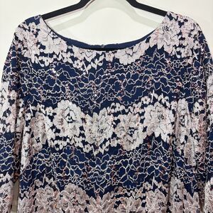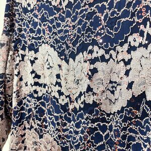 Features: Jessica Howard Shift Dress. Stunning Navy Blue with Gold Sequins & Lace. Slight rose gold shift in some light. Knee length. Sleeves are sheer, bodice is lined.