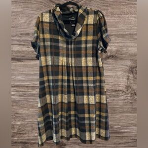 Stylish plaid dress with a cowl neck. Features a mix of black, brown, and tan colors. So cute with a pair of leggings, boots and a jean jacket.  It’s a great winter dress!
