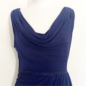 Jessica Howard Sleeveless Draped Ruched Knee Length Beaded Waist Navy Dress. Side Zip. Size 8. Special occasion formal dress. Homecoming,prom, mother of the bride, wedding. Chic navy blue dress made from polyester and spandex.