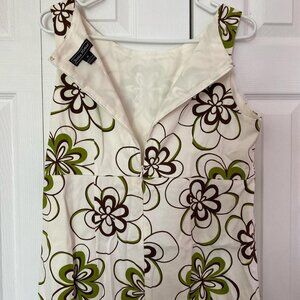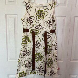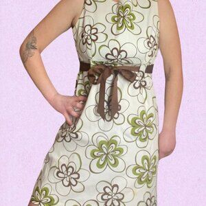Green and white floral dress with brown ribbon detail. High quality material. Has some staining on the front that could probably be removed by a thrifty dress enthusiast willing to put in some love. Hits about lower/mid thigh on 5’8” woman. #floraldress #springvibes #cottagecore #retroglam #retro