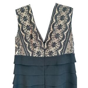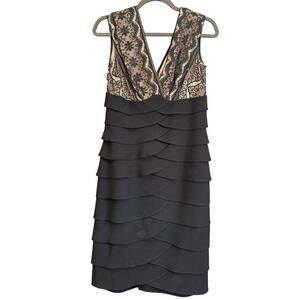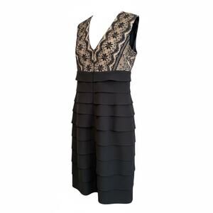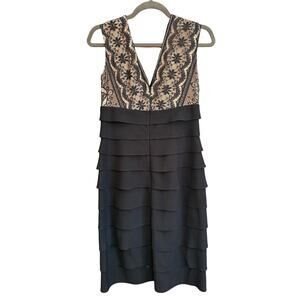 Jessica Howard Sz 6 Black Laced Bodice Tiered Dress Back Zip Fully Lined Sleeveless. Perfect for special events or for formal wear. The perfect amount of stretch makes this dress perfect for all body types. It has deep "V" in front and back. It easy to step to put on and is securely fastened in the back with a long zipper and one hook & eye closure at the top.