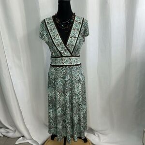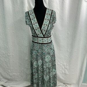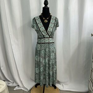 Elegant dress with teal and brown patterns. Ideal for stylish outings. Short sleeves and a hidden side zipper. V-neck ( necklaces not included) Material polyester and spandex.Pre owned gently used in good condition. Size. Talla 6 . All measurements are approximate. Arm pit to arm pit 16 Inches. Length.45 Inches. Waist front 13 inches/ back 13 inches = total 26 inches circumference .Inches. See photos for measurement information.