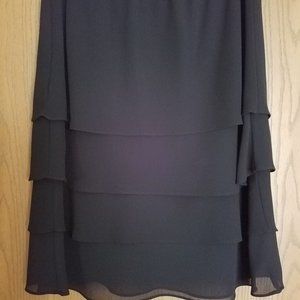 The skirt has four slightly ruffled tiers, a side zipper and some elastic at the back; 23 inches long