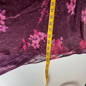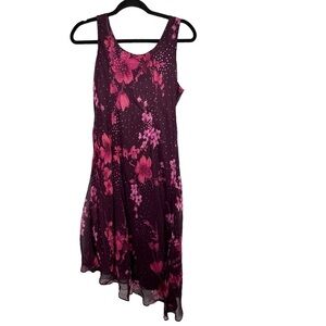 Asymmetric Hem, Floral and Rhinestone patter, Sleeveless, Lined, Deep Purple with a touch of pink. (almost a magenta). Slip on