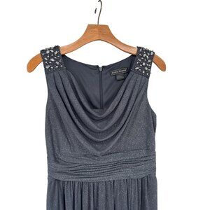 This elegant sleeveless gray cocktail dress from Jessica Howard features stunning beaded shoulder accents and a shimmering fabric. Its classic design with a draped neckline and figure-flattering waist gathers makes it a sophisticated choice for formal gatherings.
