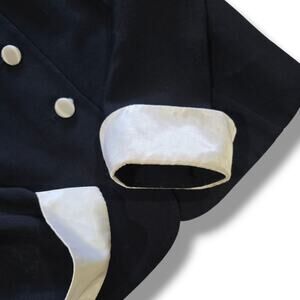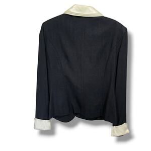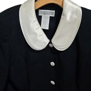 Chic Jessica Howard women’s vintage button-down jacket featuring a bold white satin-look collar and cuffs with matching buttons. Timeless black-and-white contrast design. Shoulder pads. Size 10, rayon/acetate blend. Pre-owned, gently worn. Originally part of a 2-piece set — listing is for jacket only. Perfect for vintage lovers or statement style.