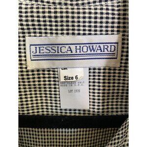 This Jessica Howard vintage maxi dress features a classic houndstooth pattern, mandarin collar, and tie waist. Designed with timeless elegance and perfect for various formal or casual occasions.