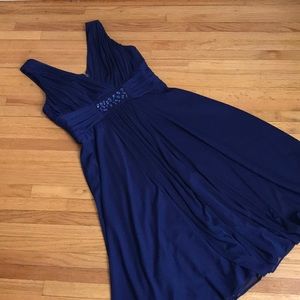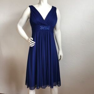EUC this is a beautiful flowing dress in deep rich blue with purple tones. It is shirred in the empire waistband and at bust with chunky beautiful blue faceted acrylic beads below the V neck at bust line. The outer layer is sheer. It is fully lined. It has built-in pads in the bra area it is 100% polyester and can be hand washed and line dried.