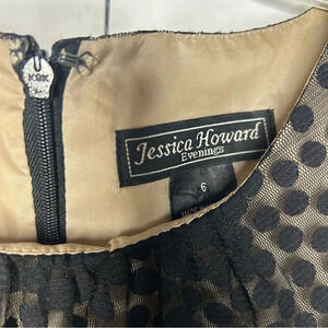 Jessica Howard cocktail dress. Polka dot sheer with tan fabric underneath. Long zipper in the back. Loops for a skinny belt or ribbon or could be cut off. Nylon polyester blend. Excellent preowned condition.