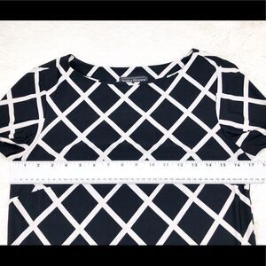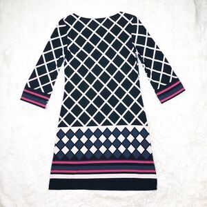 Super cute pre-owned Jessica Howard Black and White Lattice Diamond Print Shift Dress with 3/4 Sleeves, Size Small. Stretchy and comfy, the kind of work dress you can pack in a suitcase without it getting wrinkled. Print at bottom changes so it gives a slimming illusion by bring the eyes downward. No stains or holes. Please ask all questions before purchasing.