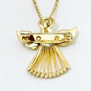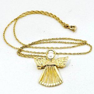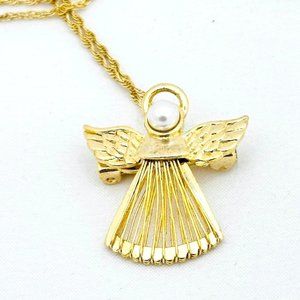 Vintage Jessica Lauren Treasures angel brooch/pendant with an approx. 19" chain. The angel is gold plated with a faux pearl head. Vintage estate jewelry. Very good overall vintage condition. Gold tone color and finish are very good on the chain and angel. The half loop bail on the back is big enough for the chain to be removed so it can be worn just as a brooch. The angel measures approx. 1.25" x 1-1/8".