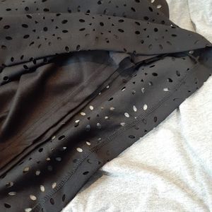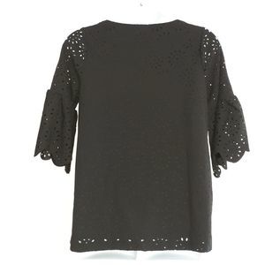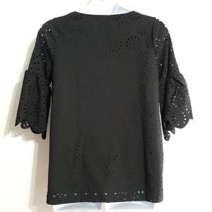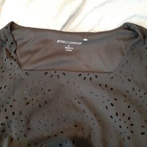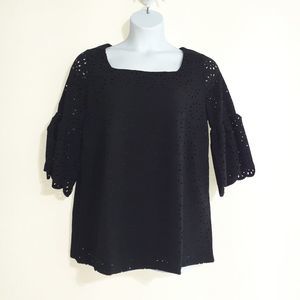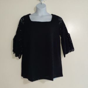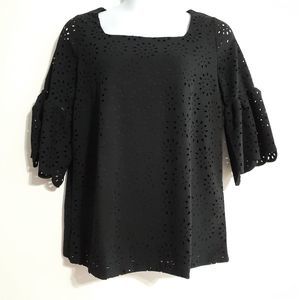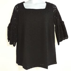 NWOT black bell sleeved tunic top with laser cut floral cut out overlay in size 12 by Jessica London