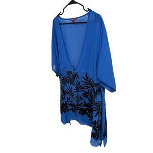 Jessica London Blue Sheer Tunic Top Black Floral Print Deep V Neck Size 24W