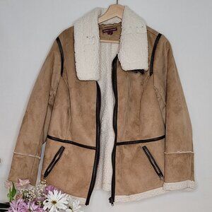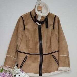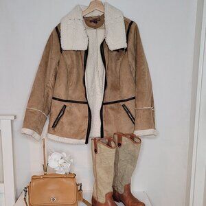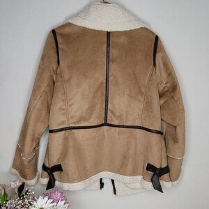 To take you for a spin. A suede camel and white shearling biker jacket featuring side pockets and buckles on the waist and around the neck. Stay warm, look cool—don't settle for less.