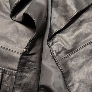 Excellent condition Jessica London genuine leather jacket. This black blazer features a plunge neckline and front hook and eye clasp closure. This jacket has beautiful shape and paneling to contour the body and be longer in the front. Front lapels fold over in the front for extra movement. Features front scrunched pockets and puff sleeves.