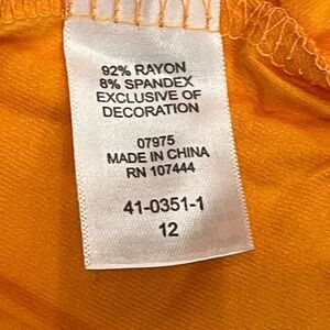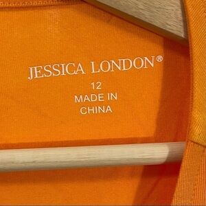 Vibrant orange tunic with crisscross neckline. Short sleeves. Stylish hem detail.