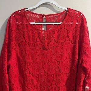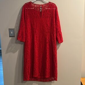 Elegant red lace dress with three-quarter sleeves. Perfect for special occasions. Stunning Jessica London women’s plus-size shift dress in a bold red lace overlay with a soft matching lining. Features a flattering round neckline with keyhole back, 3/4 sleeves, and knee-length silhouette. Perfect for weddings, holiday parties, or special occasions. Size 24W. Excellent condition – worn once, no flaws.
