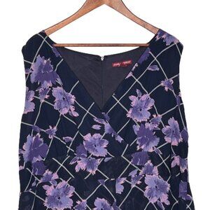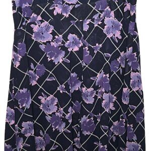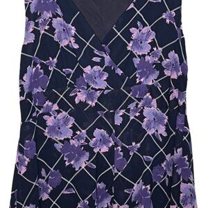 Purple and pink floral print on navy blue background with white diagonal stripes