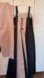 Elegant maxi dress with black and pink design. Features lace-up back detail. Perfect for formal occasions.