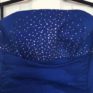 A simple but beautiful formal dress by Jessica McClintock! Perfect for homecoming or prom! This strapless mini dress has a rouched look and rhinestone detailing on the bust. I have only worn this once (to homecoming) and it is in great condition! Purchased from a Jessica McClintock store.