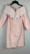 Vintage 80's or 90's peachy pink sheath dress with white lacy overlay yoke that goes around the neckline and shoulders, 3/4 sleeves, fully lined. Has elastic bands inside to hold dress on upper shoulders. Back zipper and back kick pleat. Boning in the bodice.