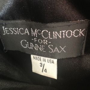 Beautiful Jessica McClintock cocktail dress size 3/4, fits more like a 2. Black with small white polka dots. Satin bow ties around waist (removable). Tulle shows on bottom dress about one inch in length. Wore only once. Fits to body. Tight fit on top then flares out a little by waist. Falls above knee. Condition is like new!