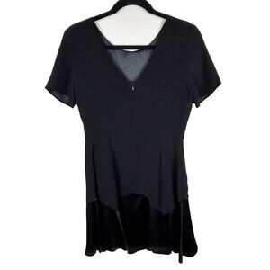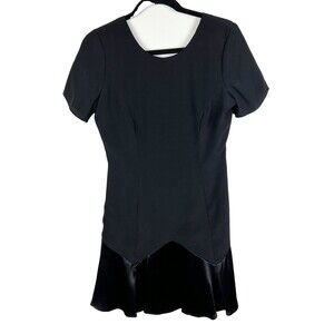 Jessica McClintock Collections vintage black short sleeve dress with ruffle hem detail. This classic, adorable little black dress has a feminine retro twist with mixed texture fabrics and a satin bottom ruffle, Round neckline, short sleeves, back v-neck with zipper. Made in USA. Excellent used condition. Women's vintage size 6, measurements pictured.
