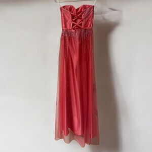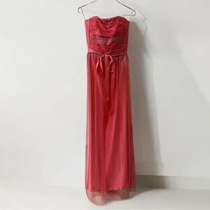 Gorgeous dreamy dress worn once. Needs to be dry cleaned. A few small marks on front bottom side and one small spot on side of dress. They might come out once professionally cleaned. Also there’s a pull on the back bottom of the dress. No tearing or holes, and comes from smoke-free home. Please see photos. All sales are final.