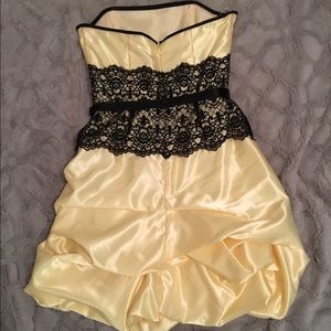 Jessica McClintock dress. Perfect condition, used once. Yellow ruffled bottom with black lace waistline. Ribbon ties around waist but is removable. Great for Sweet 16, Prom, or Homecoming. Size 7
