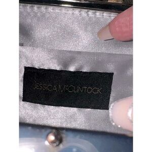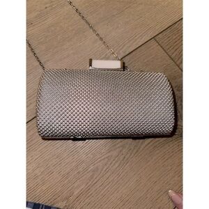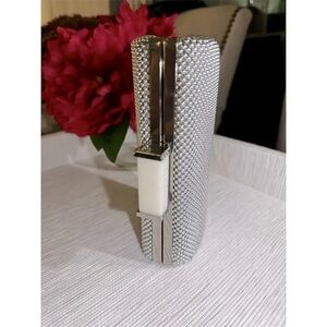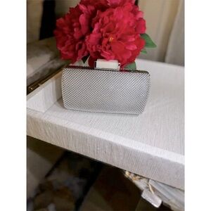 Keywords: Jessica McClintock, silver clutch, beaded mesh, formal clutch, evening bag, detachable chain strap, satin interior, clasp closure, women's accessories, formal occasions, elegant clutch, gala events, wedding accessory, silver evening bag, new condition.