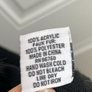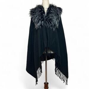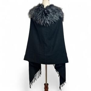 Black and grey faux fur lined shawl with fringe trim. Has one hook enclosure in the front behind the fur and the rest drapes open.