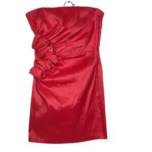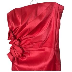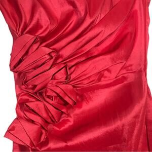 A hidden back zipper and a ruffle flower detailing flows down the side. The neckline is straight across.