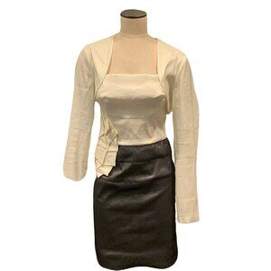 This elegant Jessica McClintock dress and jacket set is perfect for any formal occasion. The strapless dress features a pleated satin fabric in shades of gray and ivory white, with a knee-length hemline. The matching long sleeve bolero jacket adds a touch of sophistication and is made from the same satin material. The dress has a zip closure and a straight neckline, making it a classic and timeless choice for any party, holiday, or special event. The set is a size 12 and made from a blend of polyester, nylon, and spandex. This jacket dress is ideal for those who want to feel like a princess and make a lasting impression.