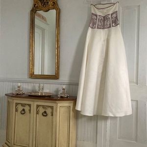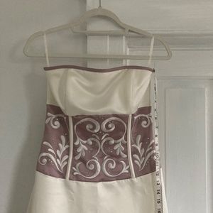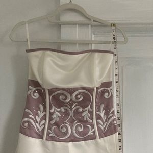 Classic Jessica McClintock formal gown. White and purple satin, with tule underlay. Beautifully embellished with embossed needlework! This dress is so romantic! It has a couple tiny stains (see pictures), and I don’t have time to dry clean it, so it is priced accordingly. Feel free to make an offer.