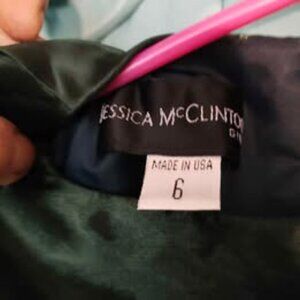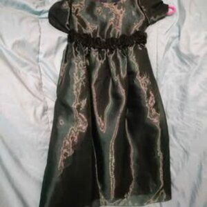 Really pretty deep green shiny material with flowers around waist. Measures from waist to hem 24" like new